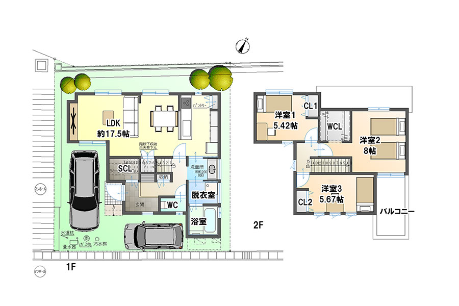 ●敷地面積:108.78㎡(約32.90坪)~225.54㎡(約68.22坪) ※有効面積 172.66㎡(約52.22坪)