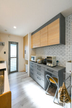 - グレー×木目が映えるシックな印象のキッチン