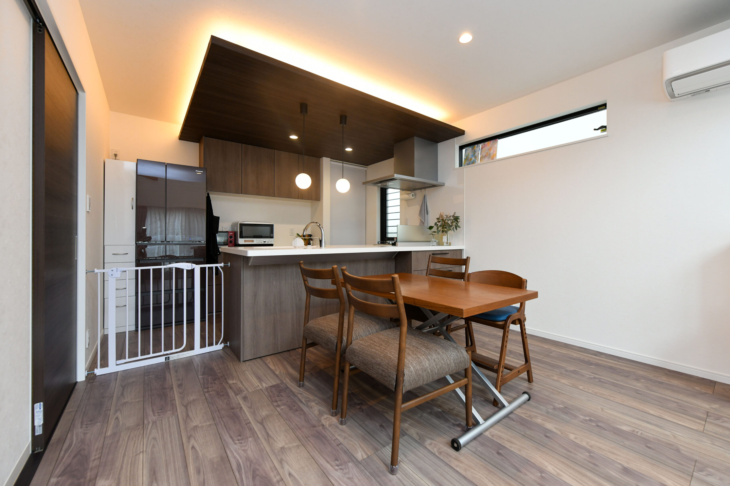 - シックな雰囲気を作り出す下がり天井と間接照明